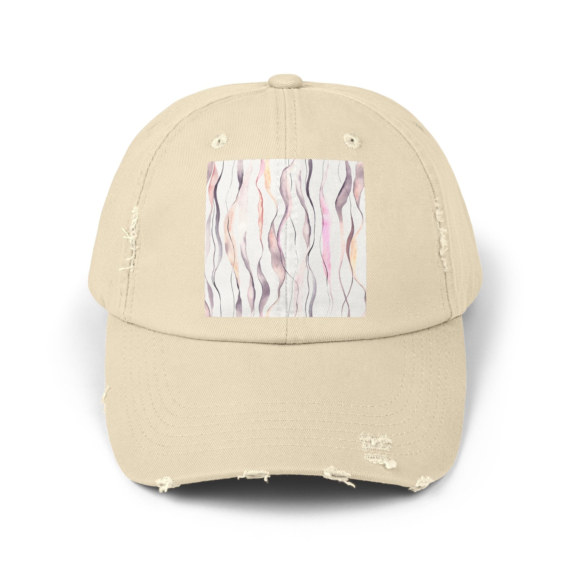 A soft, lived-in cotton cap that carries a quiet, artistic mood. Faded sand tones and gentle distressed details make this hat feel like an old favorite the moment you put it on. The front square print features flowing, watercolor-like lines in muted pinks, grays, and creams — an understated, organic pattern that adds subtle personality without shouting. Lightweight and unstructured, it sits low and comfortable on the head, tucking behind hair or a ponytail with ease. Wear it to slow mornings, gallery strolls, or long drives when you want one more layer of calm and style.